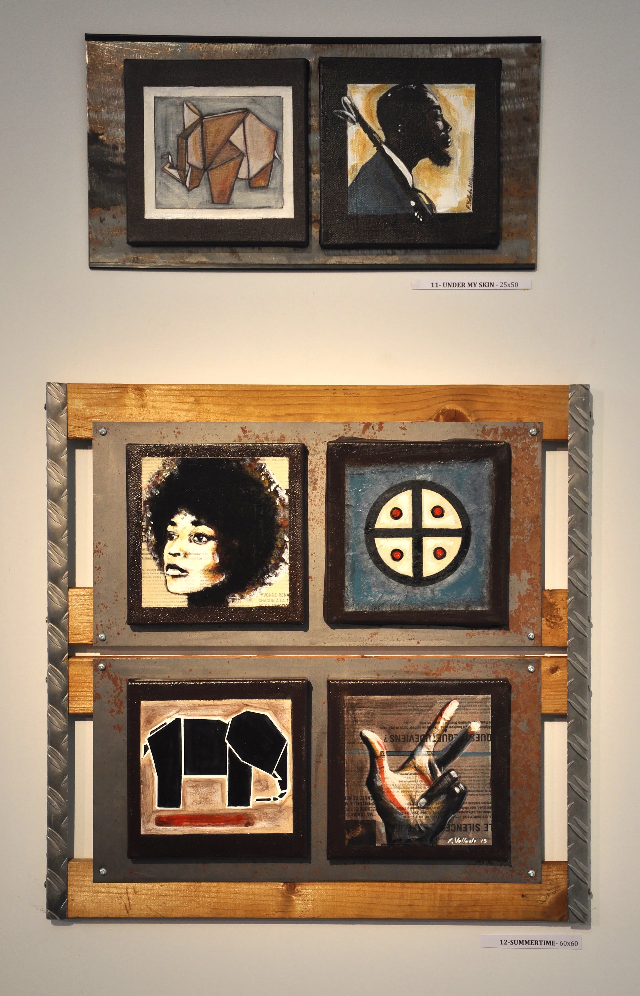 Travaux sur toile ou bois et éléments 3D intégrés.